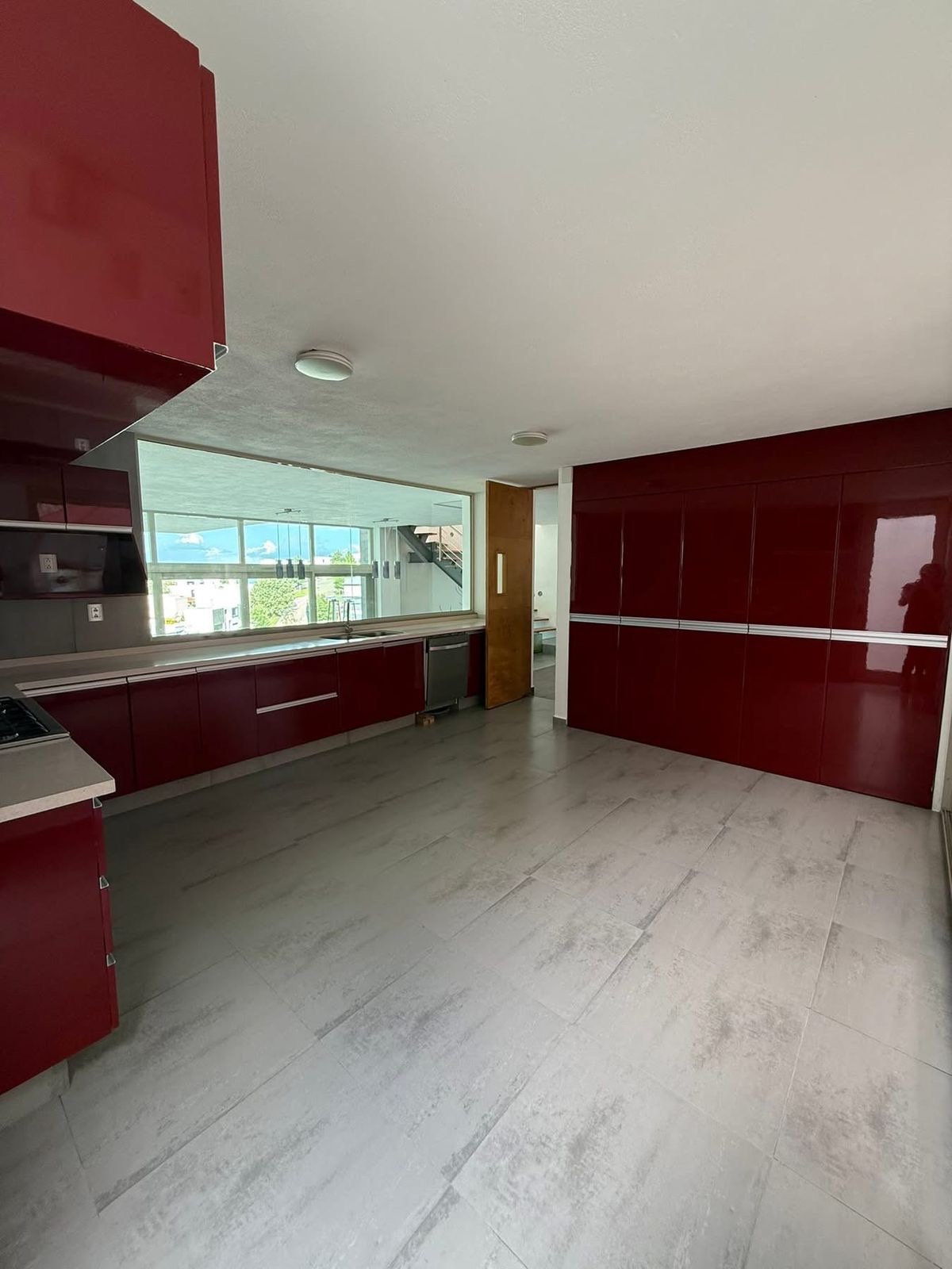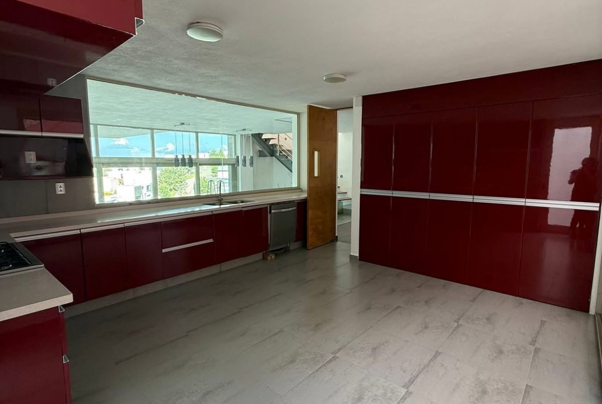 Diseñada bajo un concepto de habitabilidad, la casa se distribuye en tres niveles que priorizan la entrada de luz natural y la ventilación cruzada. La cocina integral de alto brillo en tono carmín es el corazón del hogar, ofreciendo un contraste moderno con los pisos de gran formato en tonos grises.