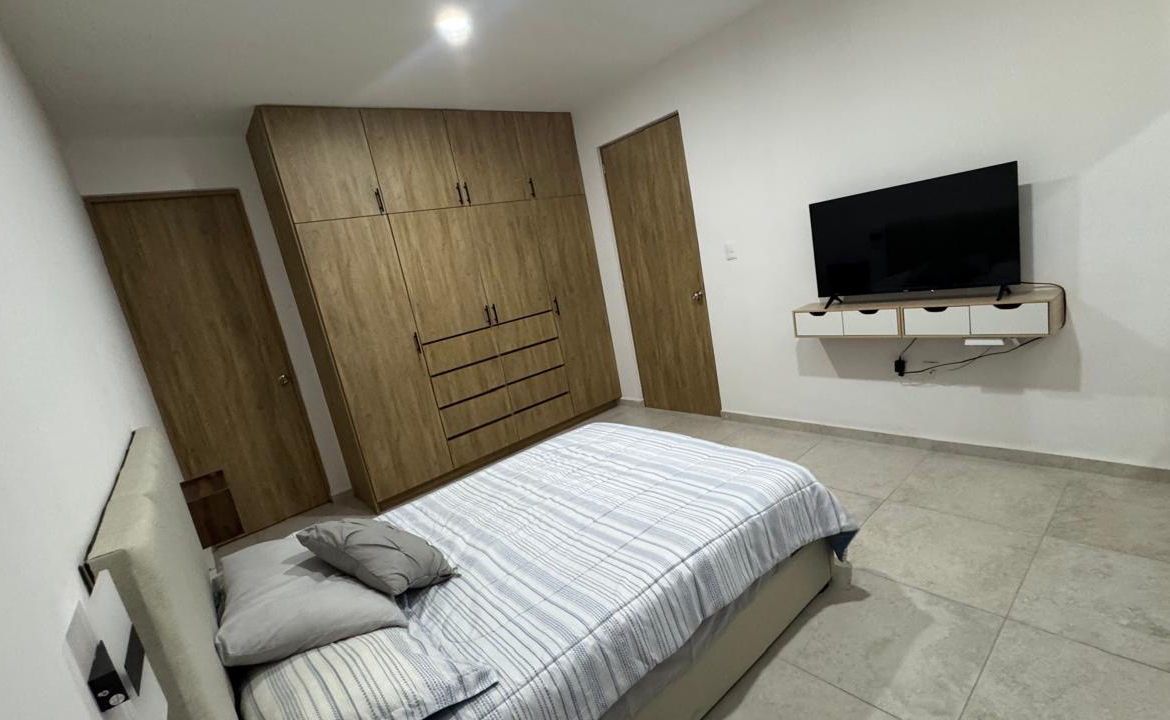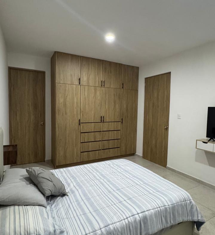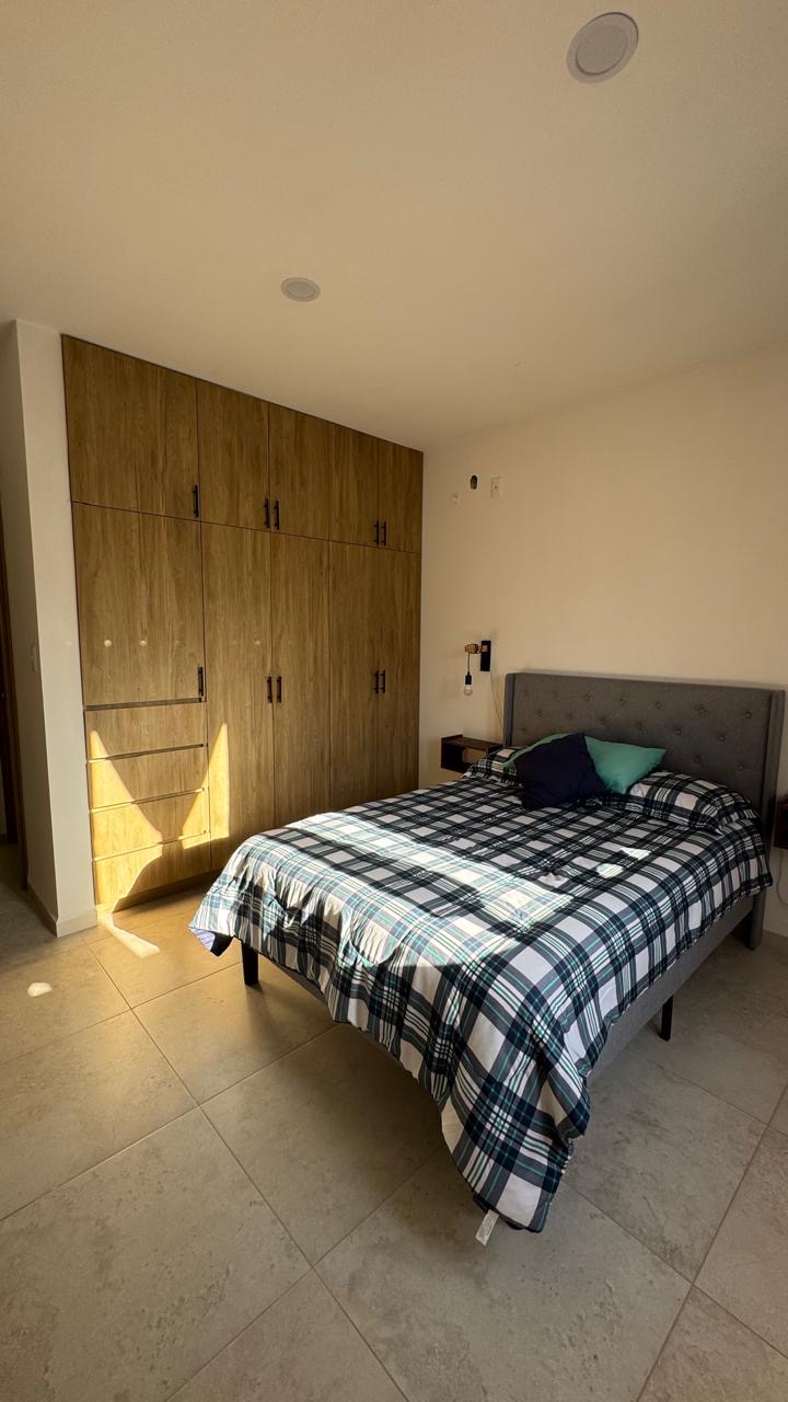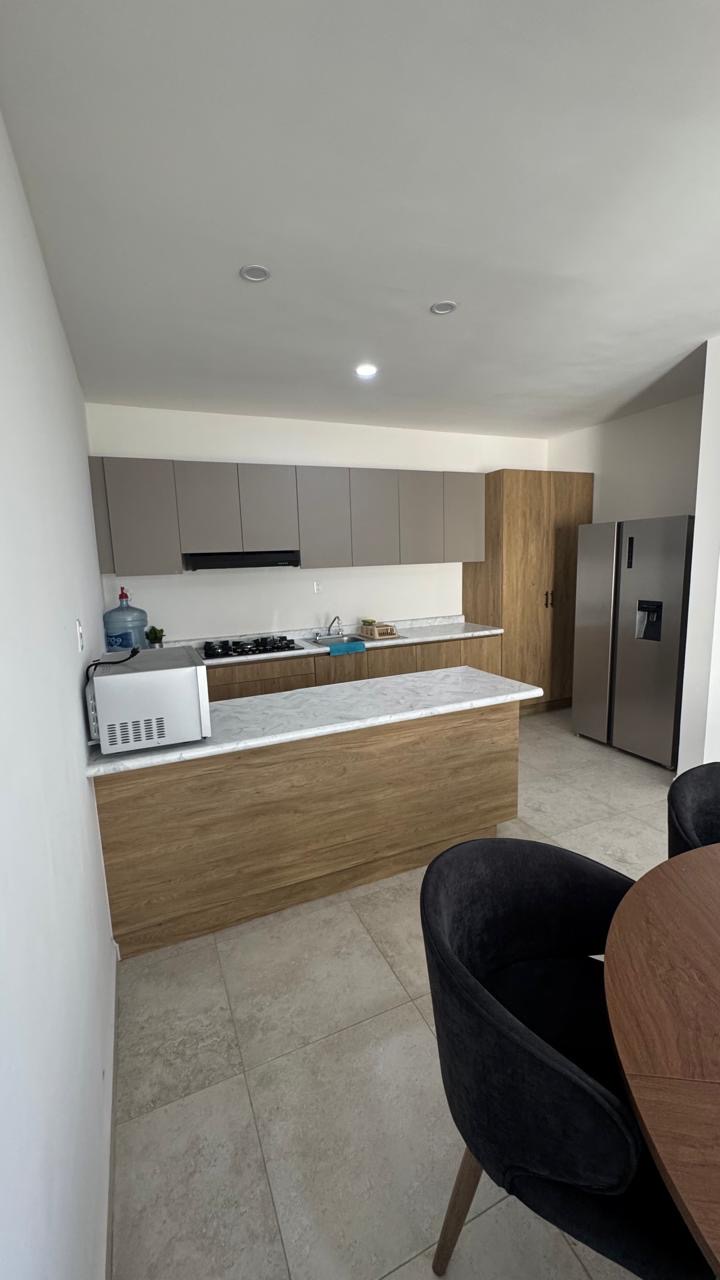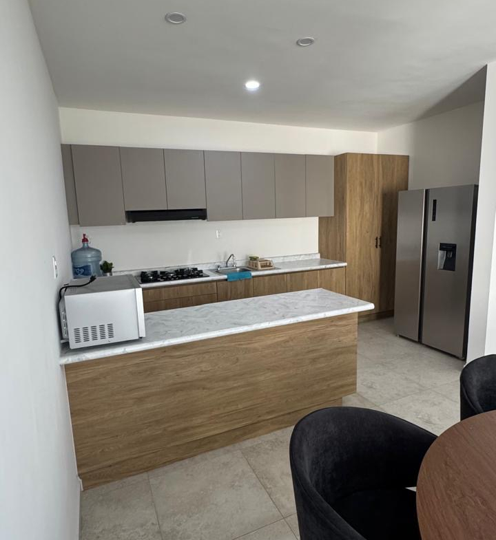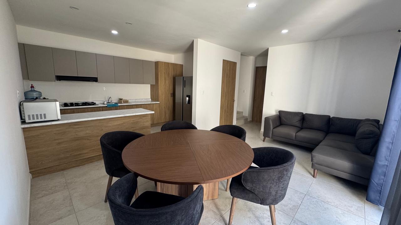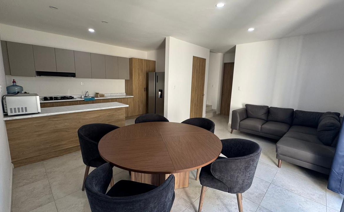 La propiedad destaca por una arquitectura funcional que prioriza la iluminación natural y la amplitud en sus áreas comunes. En la planta baja, el área social de concepto abierto integra sala y comedor con mobiliario contemporáneo, conectando con una cocina integral totalmente equipada con electrodomésticos y acabados de primera.