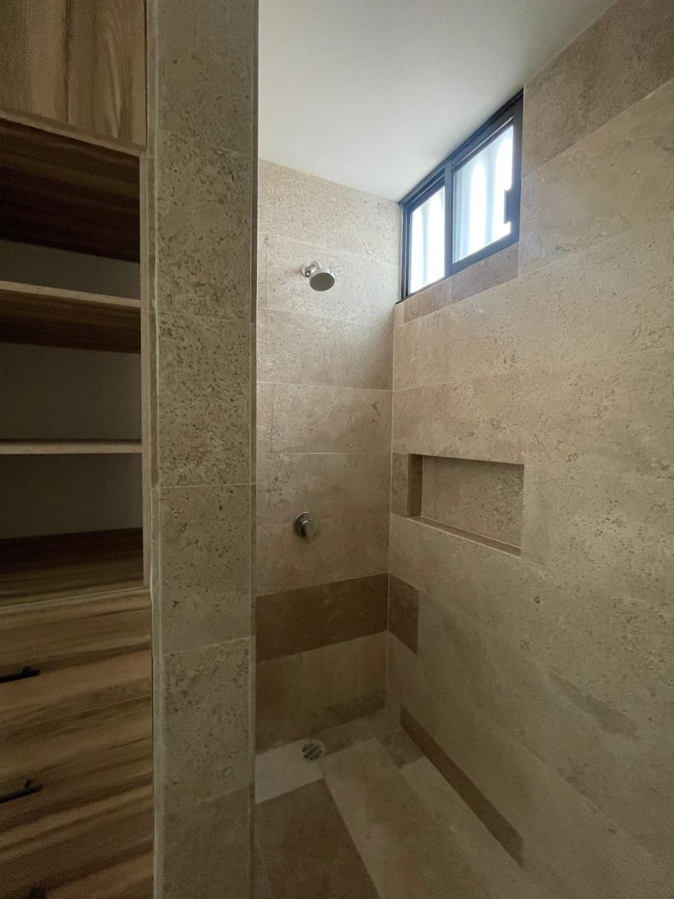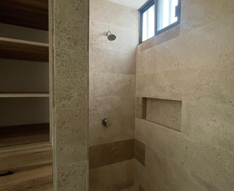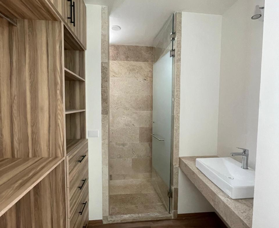 • Baños: Pisos y muros en mármol travertine con cancelería en vidrio templado