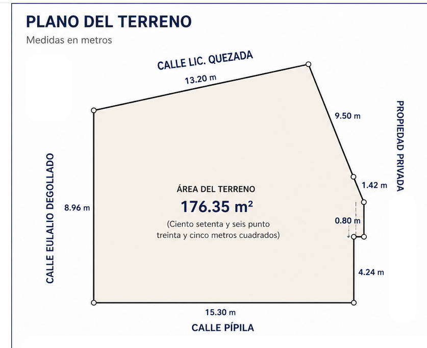 La propiedad destaca por su configuración poligonal que permite un aprovechamiento versátil del espacio. Cuenta con un frente de 8.96 metros sobre la calle Eulalio Degollado, extendiéndose con laterales de 13.20 m (Calle Lic. Quezada) y 15.30 m (Calle Pípila), lo que garantiza una excelente exposición visual y múltiples puntos de referencia. Los acabados actuales y el estado del suelo permiten una rápida nivelación para cualquier tipo de infraestructura ligera o comercial.